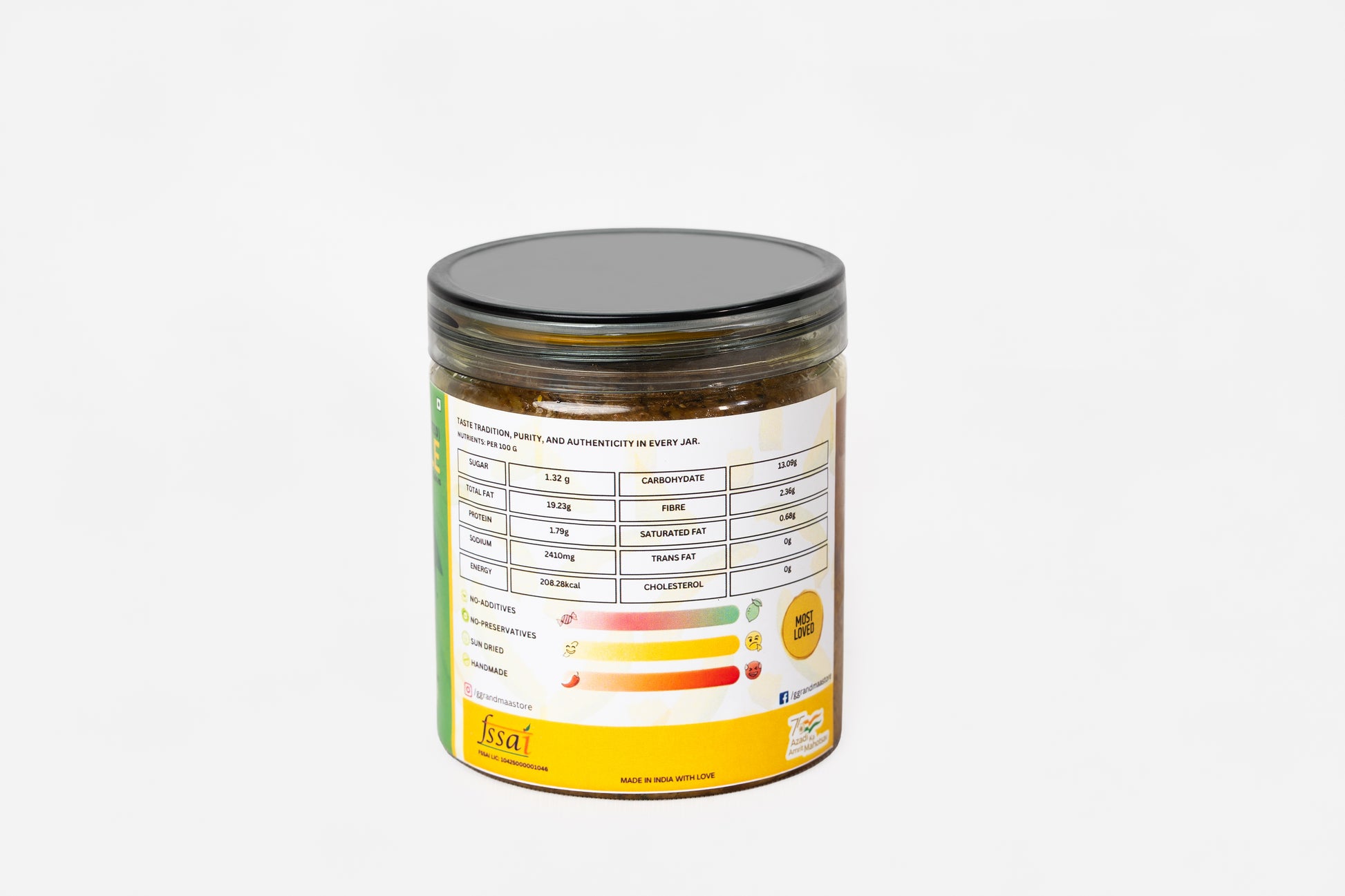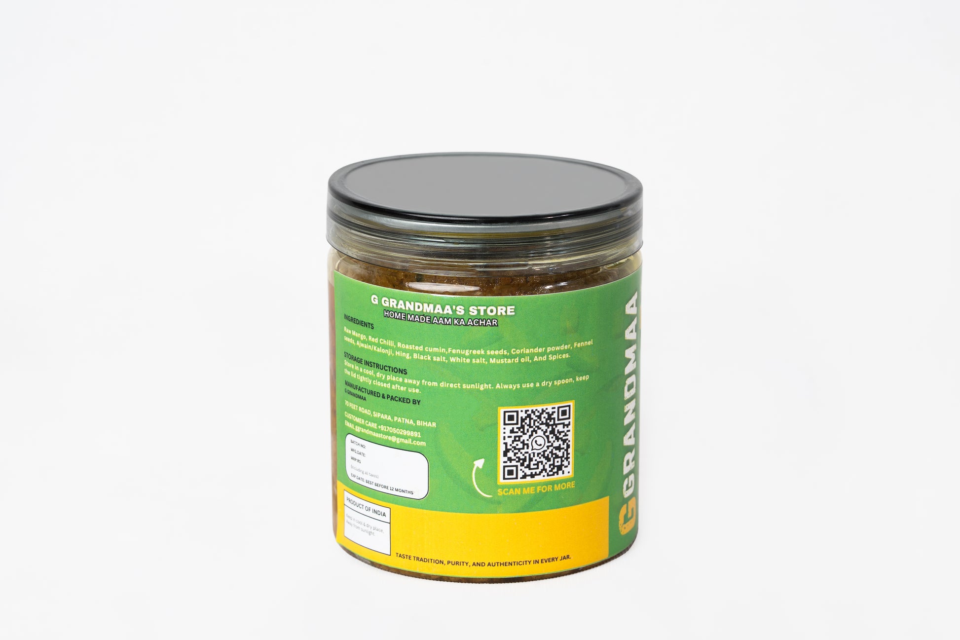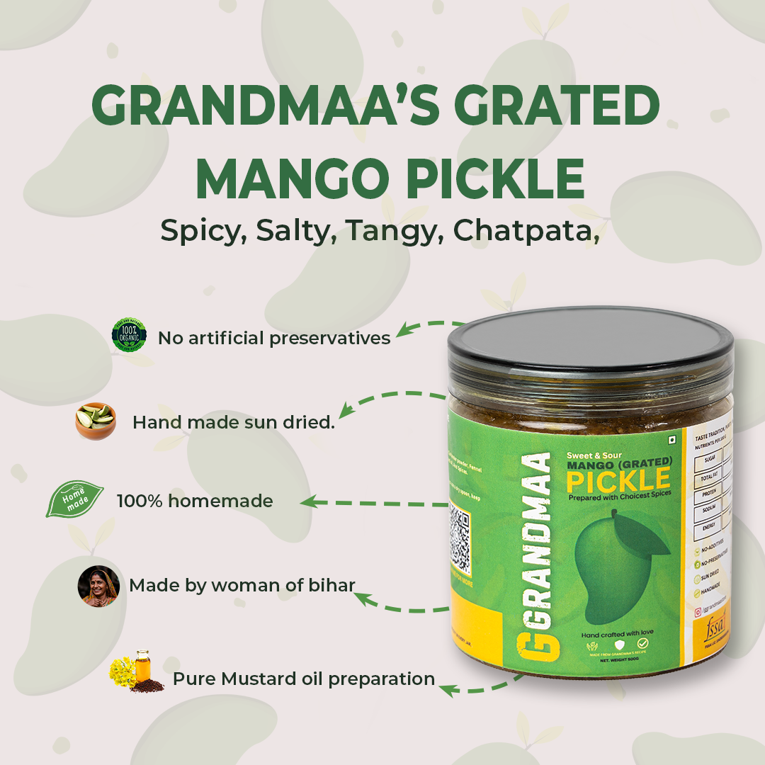 G GRANDMAA Grated Mango Pickle – The Taste of Tradition in Every Bite There are some flavors that never leave our memory – the ones that remind us of home, childhood summers, and the warmth of family meals. G GRANDMAA’s Grated Mango Pickle is crafted to bring that very feeling back to your plate. Our recipe comes straight from the traditional kitchens of India, where grandmothers would sit with baskets of raw mangoes, carefully cutting them into grated mango, and mixing them with an aromatic blend of spices, mustard oil, and love. This isn’t just a pickle – it’s a memory preserved in a jar. Every spoonful offers: Tangy raw grated mango that burst with freshness. A mix of hand-ground spices that balance heat, tang, and depth of flavor. Slow curing in mustard oil, just the way it’s done in Indian homes, ensuring the taste matures beautifully over time. Whether paired with hot parathas, a simple dal-chawal, or as a quick side with snacks, this pickle transforms everyday meals into something truly special. Unlike factory-made pickles, G GRANDMAA Pickles are prepared in small batches, following age-old recipes, with no shortcuts – only patience, care, and authenticity. Because for us, pickle is not just food. It’s a story of family, heritage, and timeless taste.