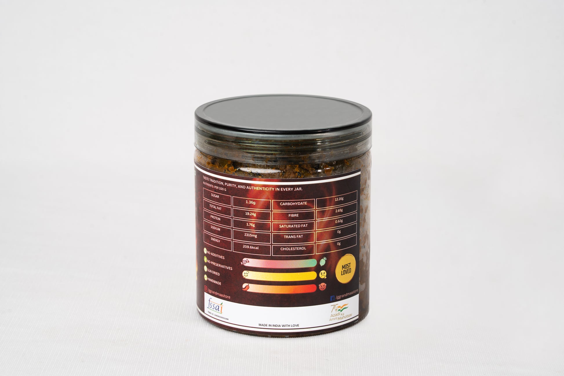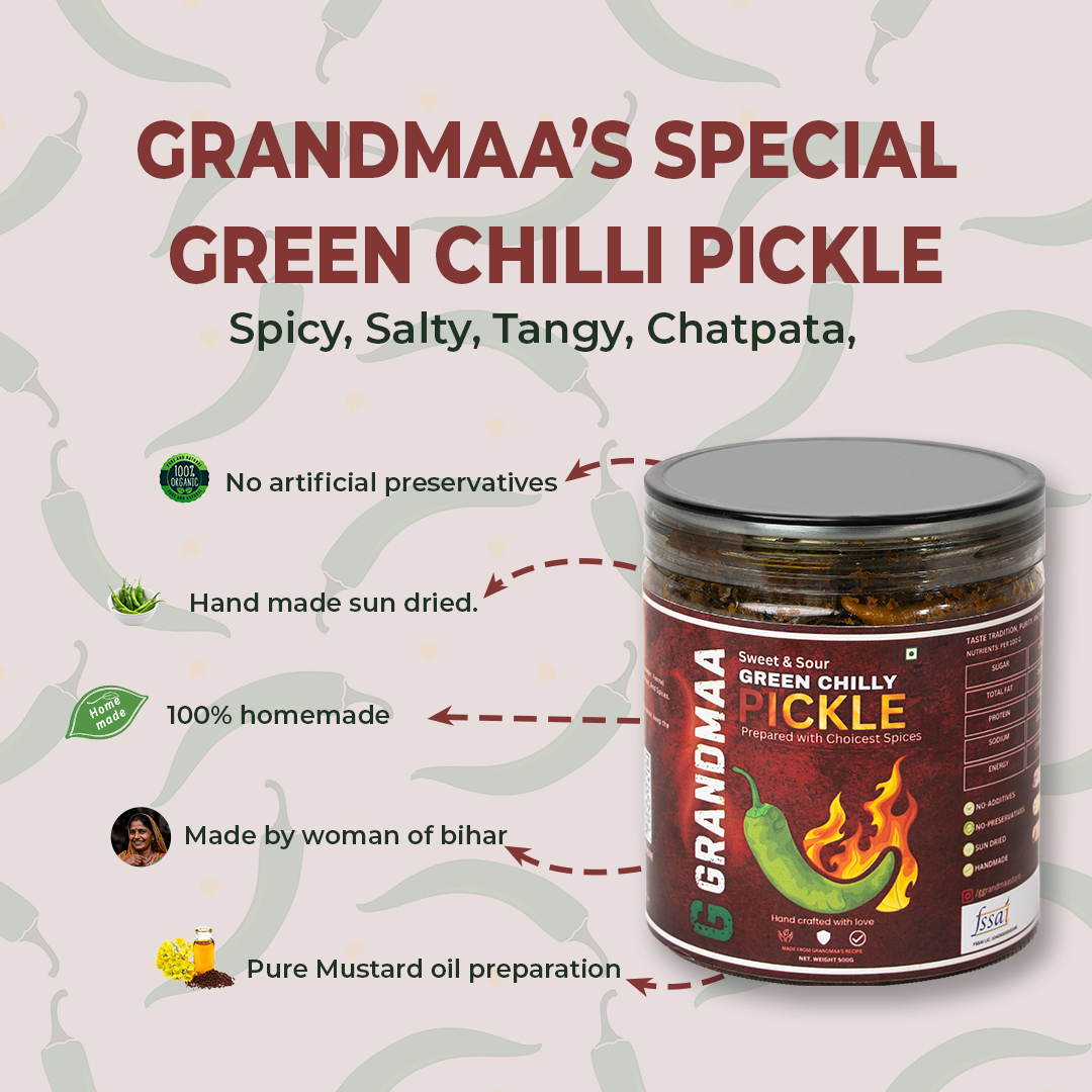 G GRANDMAA Green Chilli Pickle – The Taste of Tradition in Every Bite There are some flavors that never leave our memory – the ones that remind us of home, childhood summers, and the warmth of family meals. G GRANDMAA’s Green Chilli Pickle is crafted to bring that very feeling back to your plate. Our recipe comes straight from the traditional kitchens of India, where grandmothers would sit with baskets of raw green chillis, carefully cutting them into chunky slices, and mixing them with an aromatic blend of spices, mustard oil, and love. This isn’t just a pickle – it’s a memory preserved in a jar. Every spoonful offers: Spicy green chilly chunks that burst with freshness. A mix of hand-ground spices that balance heat, tang, and depth of flavor. Slow curing in mustard oil, just the way it’s done in Indian homes, ensuring the taste matures beautifully over time. Whether paired with hot parathas, a simple dal-chawal, or as a quick side with snacks, this pickle transforms everyday meals into something truly special. Unlike factory-made pickles, G GRANDMAA Pickles are prepared in small batches, following age-old recipes, with no shortcuts – only patience, care, and authenticity. Because for us, pickle is not just food. It’s a story of family, heritage, and timeless taste.